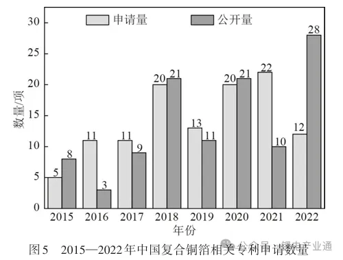 据华经产业研究院调查数据显示:2021年 国内复合铜箔相关申请量和公开量分别为22项和 10项, 从2022年专利内容来看, 专利主要集中在复合铜箔生产领域 。