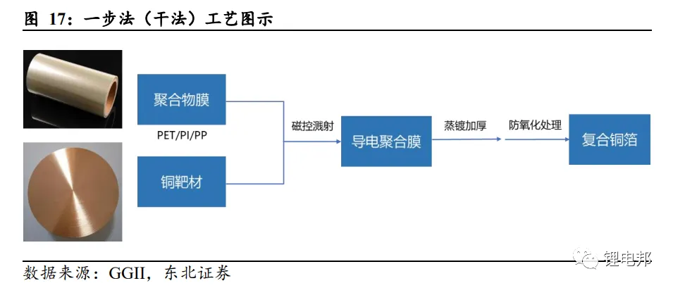 按照工艺步骤划分,目前市场上主流的复合铜箔制备工艺分为一步法、两步法、三 步法,其中一步法又分为干法和湿法。